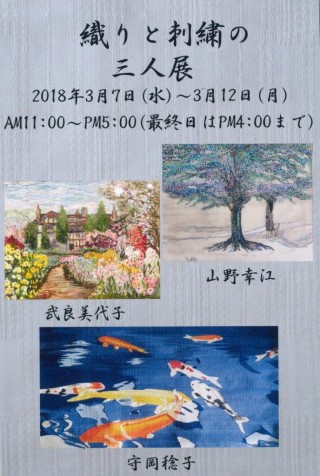 刺繍で出会って約半世紀。 3人がそれぞれ、リボン刺繍、刺し子、フリー刺繍、織り、染色と、 様々な分野で作品作りを楽しんできました。 長年作りためた作品たちを、ぜひ楽しんで頂けたらと思います。 武良美代子 山野幸江 守岡稔子 今回の展示の様子を少しご紹介させていただきます。