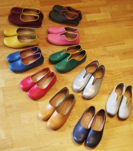 カラフルな色の革を揃え、好きな色で、はき心地良く