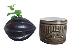 木の実や種をモチーフにした花入れや一輪挿し、また、自然灰を使った