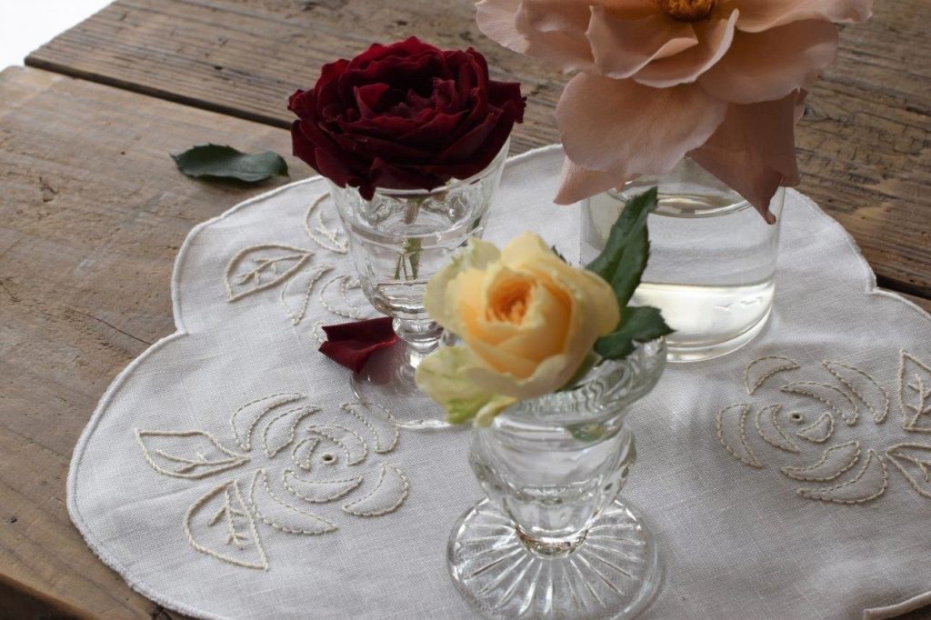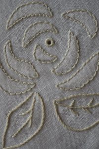 シャドウステッチで花のモチーフを刺してドイリーを仕上げます。